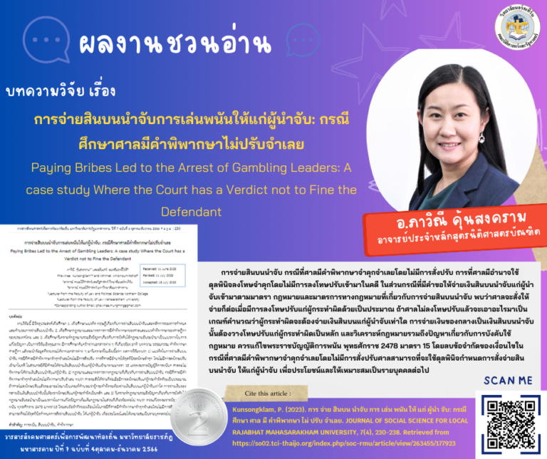 การจ่ายสินบนนําจับการเล่นพนันให้แก่ผู้นําจับ:กรณีศึกษาศาลมีคําพิพากษาไม่ปรับจําเลย