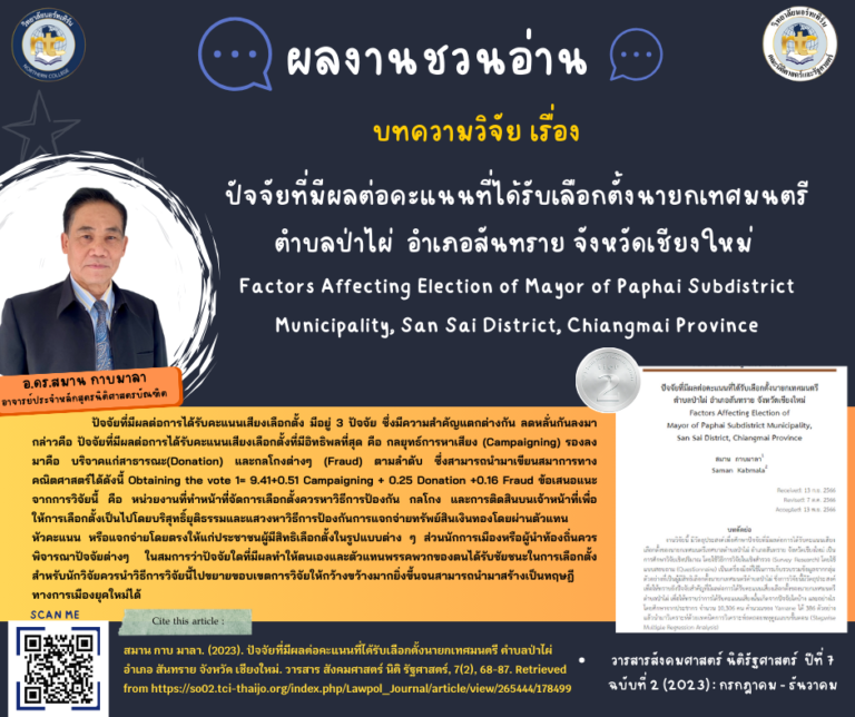 ปัจจัยที่มีผลต่อคะแนนที่ได้รับเลือกตั้งนายกเทศมนตรีตำบลป่าไผ่อำเภอสันทราย จังหวัดเชียงใหม่