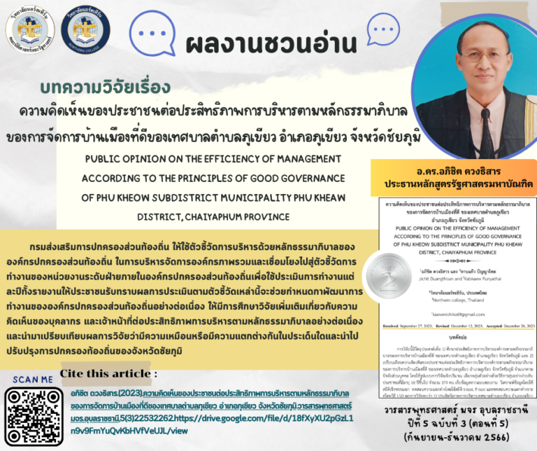 ความคิดเห็นของประชาชนต่อประสิทธิภาพการบริหารตามหลักธรรมาภิบาล ของการจัดการบ้านเมืองที่ดีของเทศบาลตำบลภูเขียว อำเภอภูเขียว จังหวัดชัยภูมิ